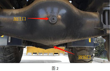 6、 工作完成后,將車輛停平穩,拉緊手制動,將前后橋的放油塞(圖2)堵拆下,放出橋包里的油液,用備用桶收集并妥善處理。將塞堵清理干凈。