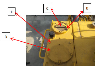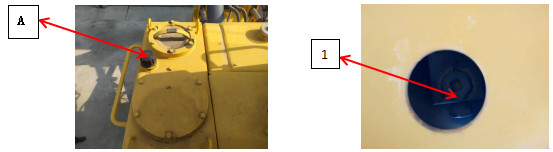 1、把推土鏟和松土器降到地面,使之停放牢靠,關閉發動機,并慢慢地轉動加油口(A)的蓋以釋放內部壓力。然后把蓋拆下。
